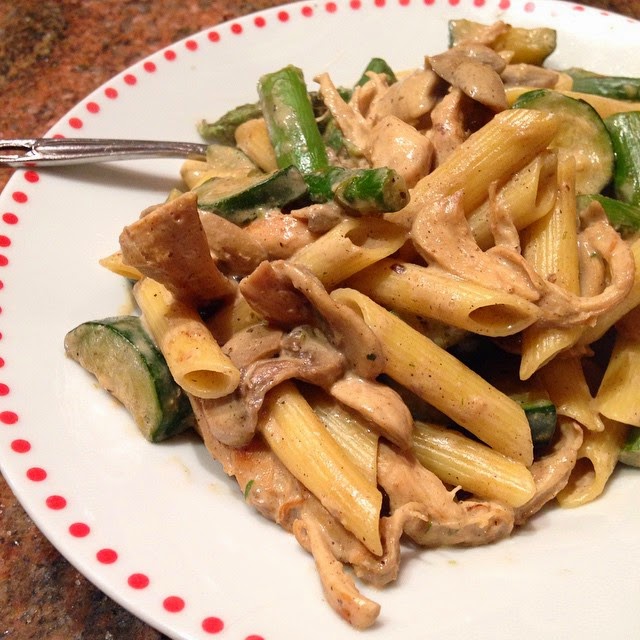 Monday: The random pasta concoction you see above! It was Creamy Dijon Chicken Pasta with mushrooms, zucchini and asparagus added into the mix!